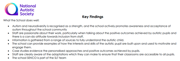 In June 2025 we were thrilled to receive our Autism Inclusion Award, an accreditation which recognises and celebrates what we have in place for our autistic pupils. The process included providing lots of evidence, case studies etc which was assessed by the National Autistic Society. As well as receiving the award and the positive feedback, which you can see some of the key strengths below, it gave us some areas to improve further which we will be working on this year.