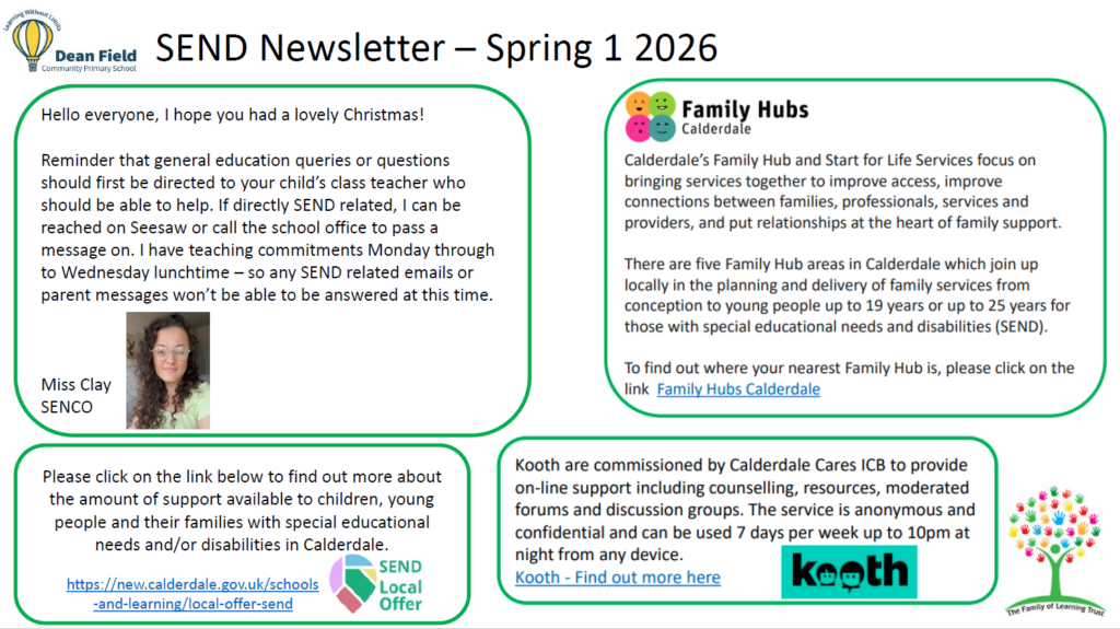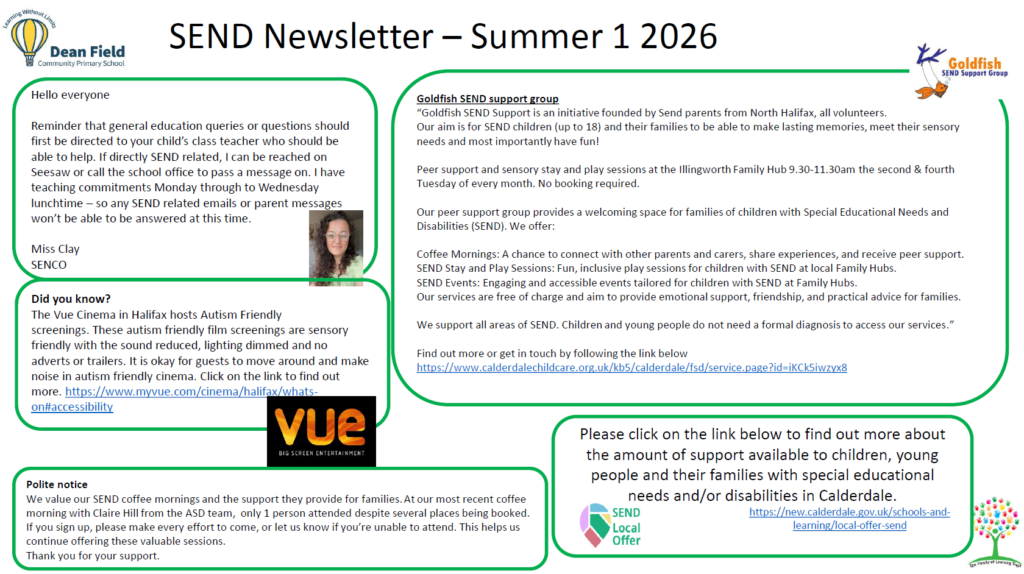At Dean Field, supporting children with Special Educational Needs and Disabilities (SEND) is a high priority. We pride ourselves on being an inclusive school where every child is valued and supported to reach their full potential. We are committed to meeting each child’s individual needs through high-quality teaching, targeted support, and strong partnerships with families and professionals.